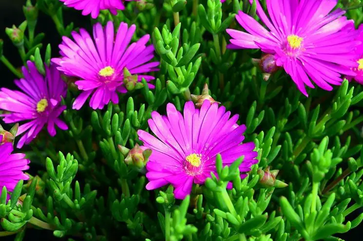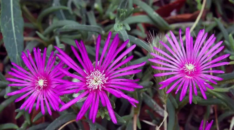 Perteneciente a la familia Aizoaceae, el mesembriantemoes una planta perenne, pero debido a su falta de robustez, al no soportar temperaturas inferiores a -5 ° C, se cultiva como anual, con excepción de las zonas sur y costeras. Forma una hermosa flor grande entre mayo y octubre. Las variedades más pequeñas pueden crecer en un jardín de rocas o formar un borde floral. Las flores, llevadas por tallos solitarios, tienen diferentes colores. Las hojas son de color verde brillante, un poco peludas. En el jardín es necesario dotarlo de un suelo bien drenado, posiblemente arenoso. Si el suelo tiende a ser arcilloso, se mezclarán un par de palas de arena antes de sembrar o plantar. Luego, se agregarán dos paladas de compost o tierra para plantas con flores. Es bueno prever 7 u 8 plantas por metro cuadrado. En maceta, mezclarás tierra para plantas con flores, con un poco de tierra de jardín. Este entorno menos rico evitará un desarrollo excesivo del follaje, en detrimento de la floración. Un jarrón de 25 cm. de diámetro albergará una planta. El mesembriantemo se planta en primavera, en abril o mayo, según la región, cuando ya no hay riesgo de heladas.