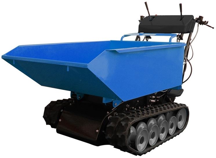 Como su nombre lo indica, este tipo de carretillas avanzan rodando sobre sus orugas, con una facilidad para enfrentarse incluso a terrenos accidentados similar al de la maquinaria agrícola. Son productos que entran en la categoría del párrafo siguiente, ya que están equipados con un motor eléctrico o de gasolina, pero son de menor interés para la jardinería común ya que son más específicos para trabajos en obras de construcción, donde el barro, la nieve o las carreteras en mal estado. se encuentran a menudo. La carga permitida en algunos casos alcanza incluso los 800 kilos gracias al gran cuerpo basculante, generalmente de acero. En casos extremos, puede resultar útil la presencia frecuente de una plataforma en la que el trabajador pueda permanecer mientras conduce la carretilla, evitando así colocar los pies en lugares peligrosos o desagradables.