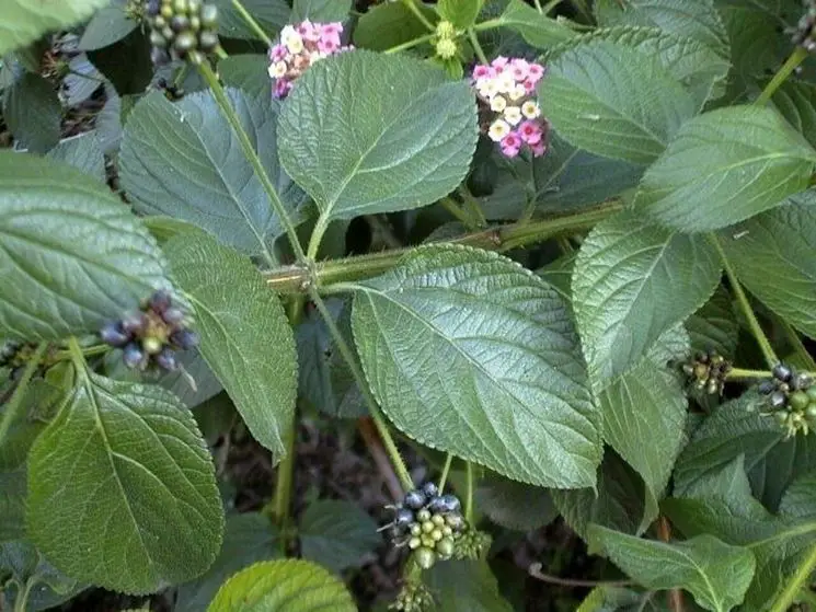 Cuando caen las corolas florales de la lantana camara, se forman gráciles coronas de frutos esféricos, primero verdes y luego azules metalizados. Entre los escaladores de origen exótico, la lantana camara se presta para embellecer jardines y terrazas. Debido a sus largas ramas, el crecimiento de la lantana puede guiarse quizás atándola a un enrejado para formar una pared completa a lo largo de la terraza. Un buen pulgar verde puede cortar las ramas de lantana camara con la ayuda de unas tijeras de jardín para hacer que la planta se convierta en un lindo arbolito. La lantana camara, si se cultiva en campo abierto, necesita un suelo bastante compacto y fértil. Las fertilizaciones de fósforo-potasio se dan treinta días antes de la floración, siempre en suelo húmedo. Los pulgones, las cochinillas, a veces incluso la hoz blanca, son los enemigos que pueden afectar a la planta.