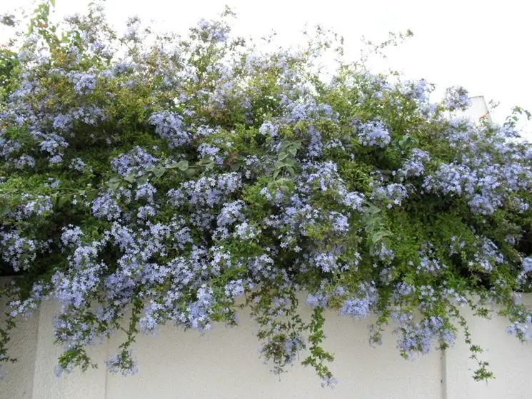 La característica principal, además de la más apreciada, del plumbago es sin duda la floración. Por lo general, comienza en verano, pero puede aparecer antes, a fines de abril, cuando se abre una extensión azul de hermosas flores en la planta. No es casualidad que se le apodara jazmín azul por su parecido con esa enredadera; Sin embargo, a diferencia del jazmín, el plumbago puede ser más elegante gracias a su color azul para cubrir marquesinas, pérgolas y paredes y embellecer jardines y villas. Las flores duran hasta octubre, por lo que puedes disfrutar de su vista durante todo el verano. Incluso las hojas pequeñas son ornamentales porque son de un verde intenso y brillante, que se adapta bien al azul de las flores. Para apreciar mejor esta espléndida floración, debes recordar nunca plantar el plumbago en el jardín.