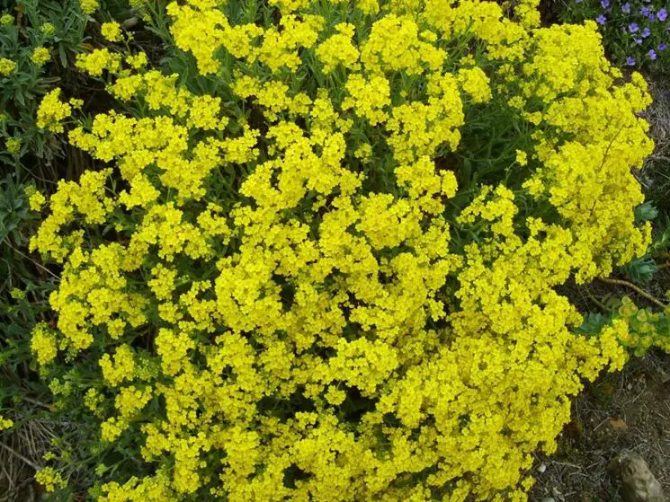 Flores amarillas y blancas para las especies de plantas herbáceas perennesAlyssum, comúnmente llamado Alisso, perteneciente a la familia Brassicaceae, tiene más de ciento cincuenta variedades diferentes. En Italia, el más extendido es el Alisso alyssoides, las hojas están cubiertas de pelo y las flores son pequeñas y amarillas. Las diferentes variedades se distinguen por las hojas de color verde plateado que se componen en forma de roseta. No requieren cuidados especiales y se adaptan bien al cultivo en el suelo y en macetas. Prefieren la exposición directa al sol y las flores se juntan en racimos, ligeramente perfumadas. El riego debe ser constante y periódico, resistente a las duras temperaturas invernales. Otra variedad es Alyssum argenteum, la floración ocurre en verano y está compuesta por racimos y flores de color amarillo brillante.