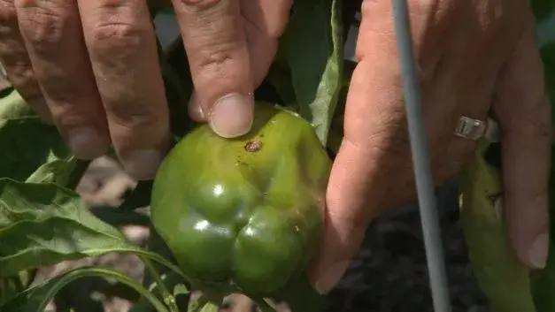 Como se ha mencionado, si hay manchas sólo en la fruta, la causa es probablemente medioambiental. La pudrición del extremo de la flor es un posible culpable. Esto comienza como una pequeña mancha marrón a bronceada en el extremo inferior del pimiento que se siente suave o coriácea al tacto. Generalmente es causada por un riego inconsistente. Asegúrate de que la tierra se mantenga húmeda una pulgada por debajo de la superficie. Las prácticas generales de riego indican una pulgada de agua por semana, pero dependiendo del clima o si la pimienta está en una maceta, puede ser necesario un riego adicional.
