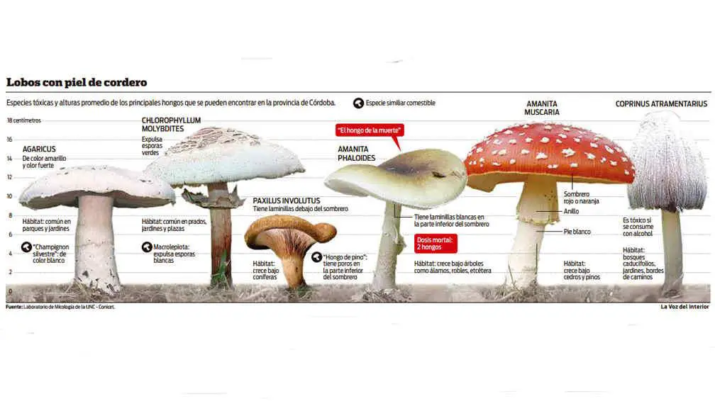 Hay miembros venenosos y comestibles de la familia agárica, todos los cuales tienen un gorro blanco, branquias que van de rosa a marrón/negro y comúnmente un tallo robusto con una falda. Una vez que se ha identificado un hongo como miembro de la familia agárica se puede deducir si es venenoso o no por el olor. Los agáricos comestibles tienen un agradable olor a hongo, ocasionalmente con un toque de almendra o anís. Los agáricos venenosos tendrán un olor desagradable que se ha comparado con el yodo o la tinta china.